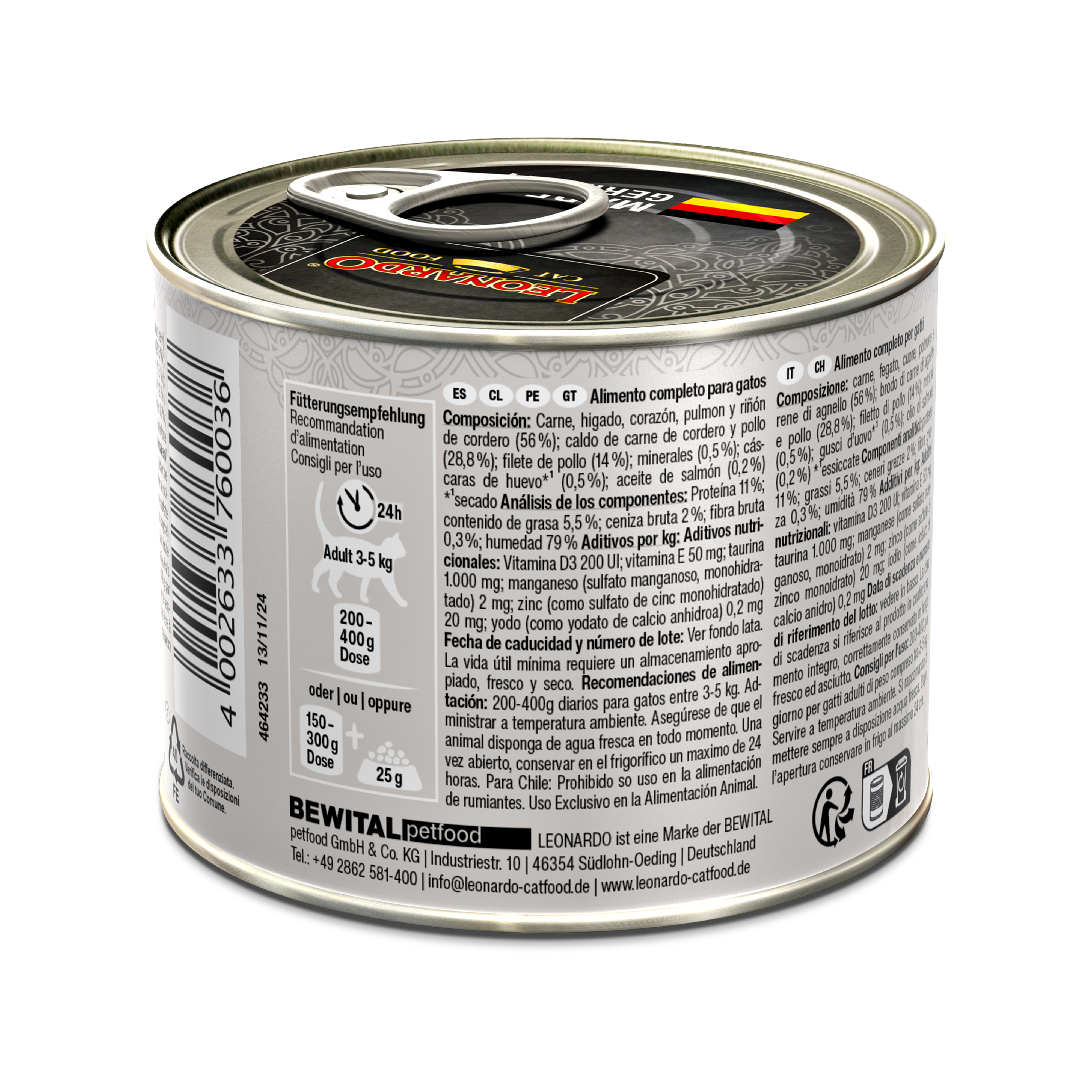 Im großen und ganzen finde ich das Leonardo Nassfutter fűr Katzen sehr gut. Nur es ist zu wenig Taurin enthalten. Es sollten mindestens 1500 mg enthalten sein, nicht nur 1000,, da auch jede Menge Taurin beim erhitzen verloren geht.. LG